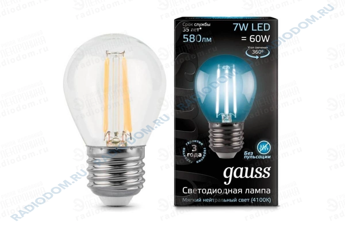 Лампа светодиодная филаментная (LED) шар 7Вт 220В Е27 4100К 580Лм 105802207 gauss