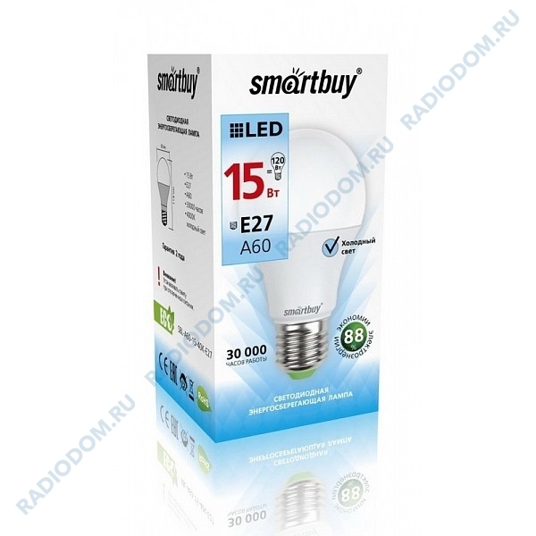 Лампа светодиодная 220В, E27, 15,0Вт, свет белый A60-15W ∕4000 ∕E27 4000K smartbuy