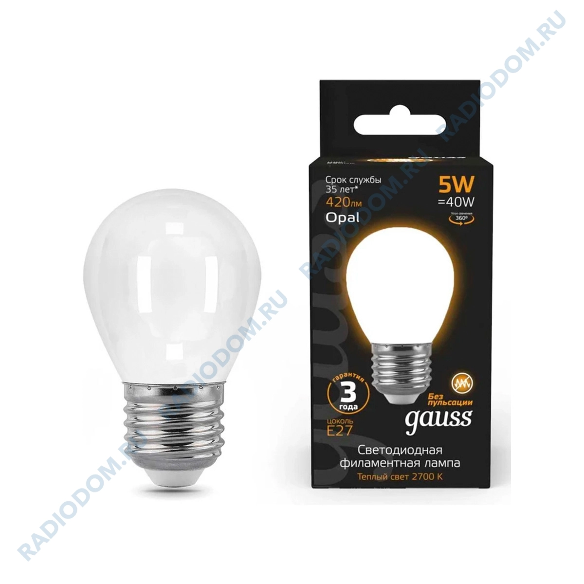 Лампа светодиодная филаментная (LED) шарообразная 5Вт 220В E27 2700K OPAL Gauss