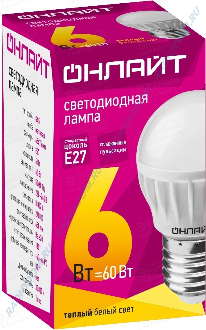 Лампа светодиодная (LED) шарообразная G45 6Вт 220В Е27 2700К 450Лм ОНЛАЙТ