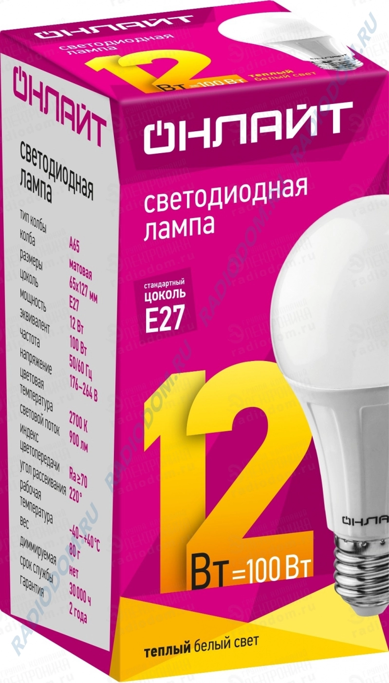 Лампа светодиодная (LED) шарообразная A60 12Вт 220В Е27 2700К 900Лм ОНЛАЙТ