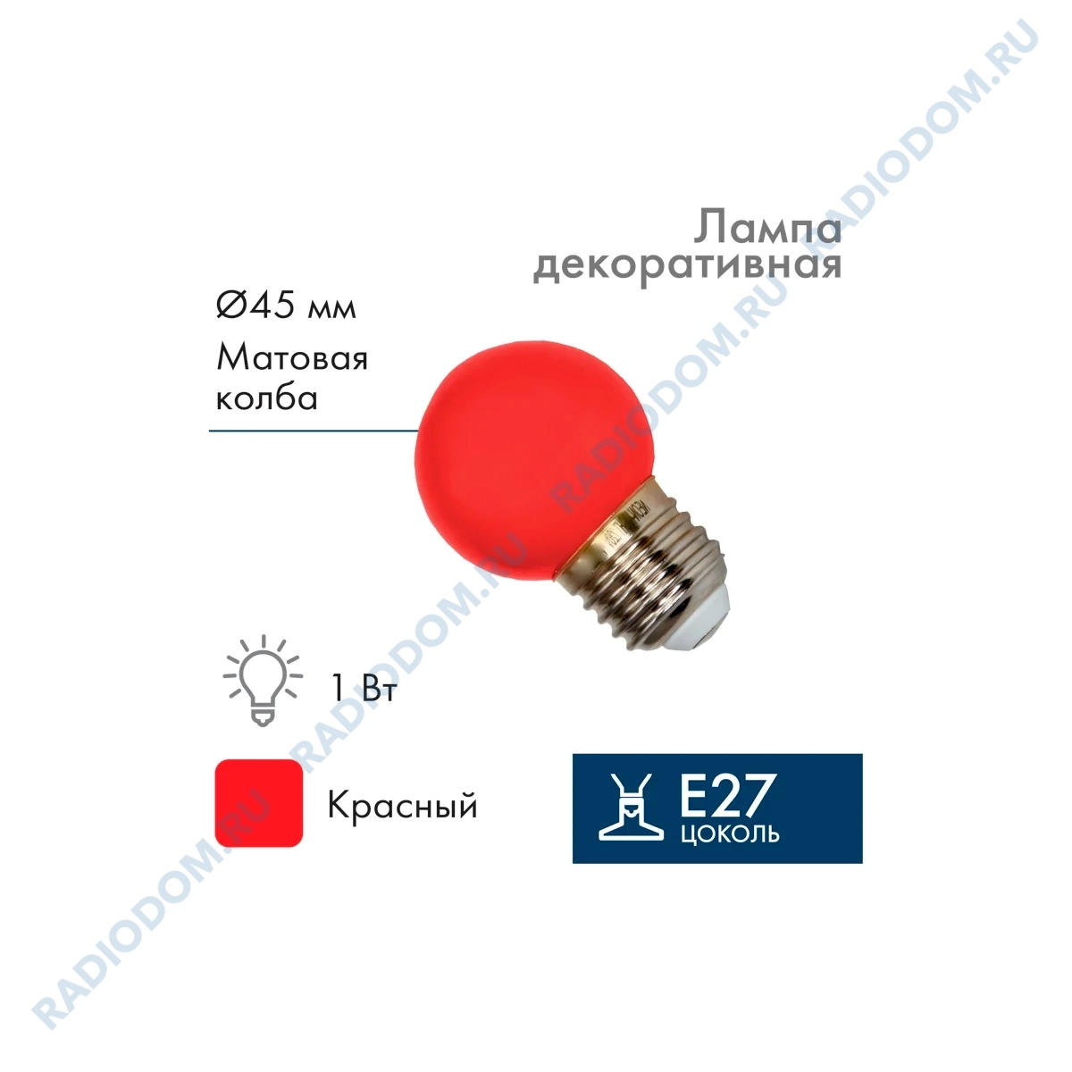 Лампа светодиодная 220В, E27, 1,0Вт, 405-112, 3 светодиода, шар, свет красный Неон-Найт