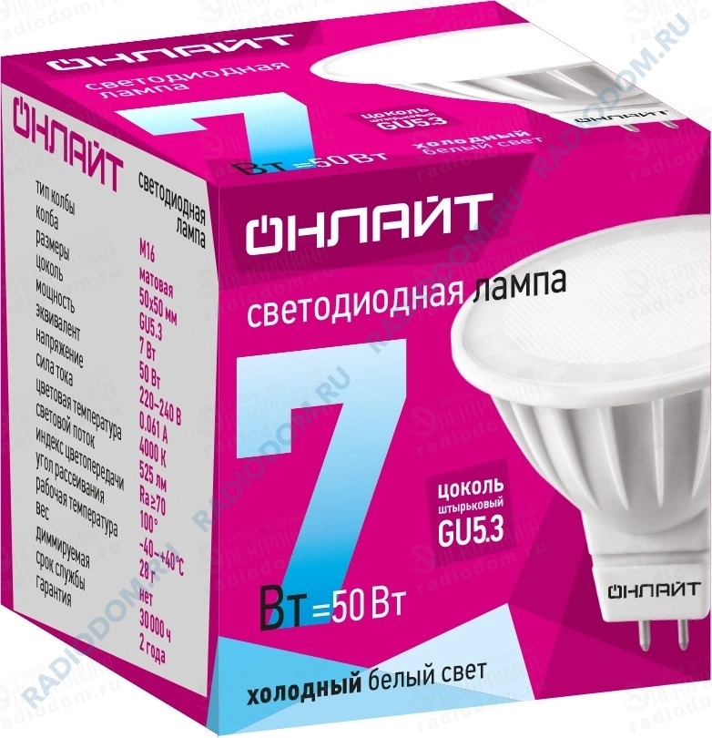 Лампа светодиодная (LED)MR16 7Вт 220В GU5,3 4000К 525Лм ОНЛАЙТ