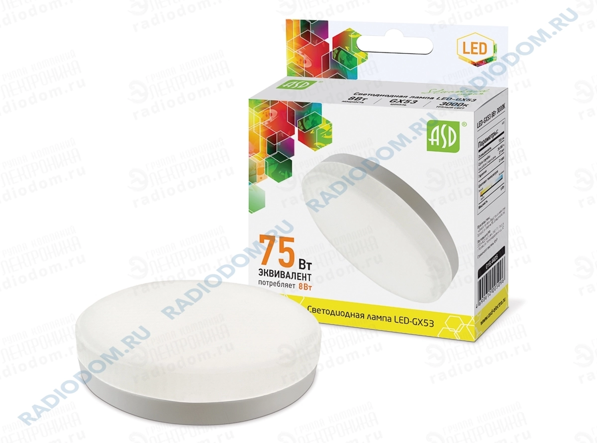 Лампа светодиодная (LED) 8Вт 220В GX53 3000К 720Лм ASD