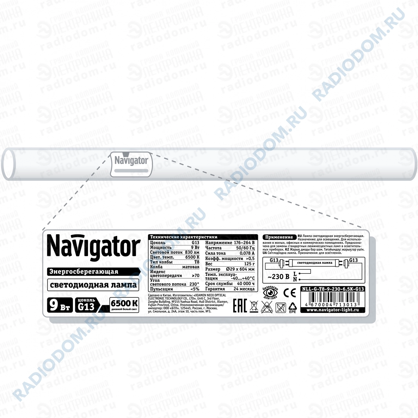 Лампа люминесцентная (LED) трубка T8 9Вт 220В G13 6500К Navigator