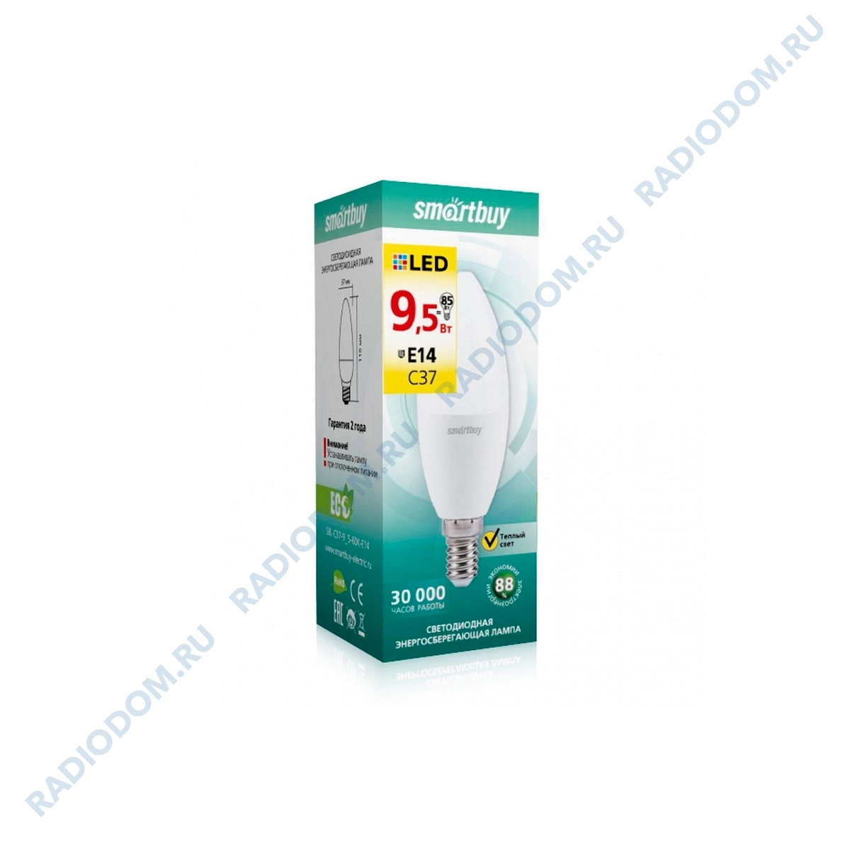 Лампа светодиодная 220В, E14, 9,5Вт, SBL-C37-9_5-30K-E14, 3000K свет белый Smartbuy