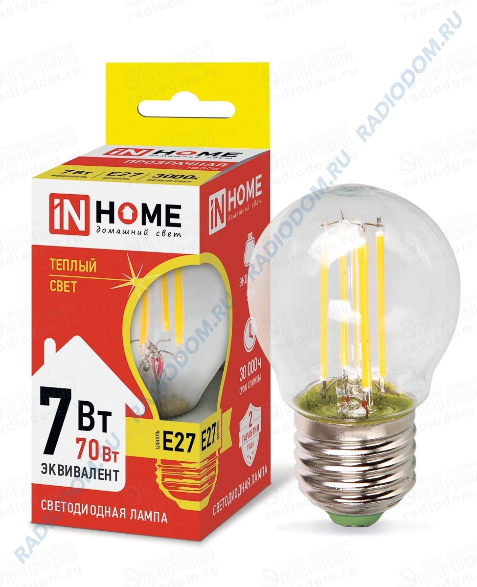 Модель серии Deco IN HOME представленная в форме шара оснащена нитевым излучателем, имитирующим лампу накаливания, идеально подойдет для вашего интерьера, подчеркивая ваш светильник не только качественным светом, но и лаконичным, классическим видом пламени свечи. Световой поток лампы равен 630 Люмен. Нить со светодиодами заменила вольфрамовую, повышая долговечность данной модели в десятки раз и обладает углом освещения 360 градусов. Цветовая температура – 3000 К – теплый белый свет, идеально подойдет для прикроватных ламп, которые успокоят ваши глаза после трудового дня и помогут настроиться на здоровый и крепкий сон. Данная лампа превосходит свои аналоги как по времени своей работы, а именно 30 тыс. часов, что превосходит 8 лет пользования по 10 часов каждый день, так и по качеству освещения, оберегая здоровье ваших глаз, испуская мягкий холодный свет без пульсации и мерцания, а сила яркости при включении сразу максимальная, что, несомненно высокий показатель в конкуренции с галогенными лампами. Клас