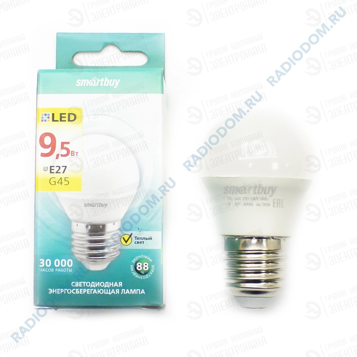 Лампа светодиодная 220В, E27, 9,5Вт, SBL-G45-9_5-30K-E27, 3000K свет белый теплый smartbuy