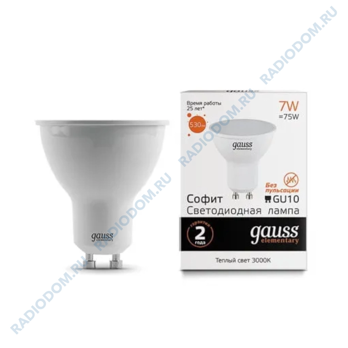 Светодиодная лампочка в форме полусферы с цоколем GU10 и размерами 45 мм по высоте и диаметром в 50 мм обладает мощностью в 7 W, благодаря чему она может осветить 2.3 кв. м. Цветовая температура – 3000 К, т.е. теплый свет близкий к цвету Солнца. Изделие рассчитано на использование в сети с переменным напряжением в 220-240В.