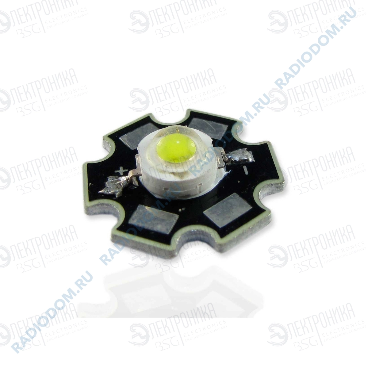 Мощный светодиод 1W, на плате star, цвет белый, температура свечения 6000-6500K, напряжение 3,0-3,6V, ток до 350mA, световой поток 100Lm, угол 120 градусов.Устанавливать на теплоотвод.