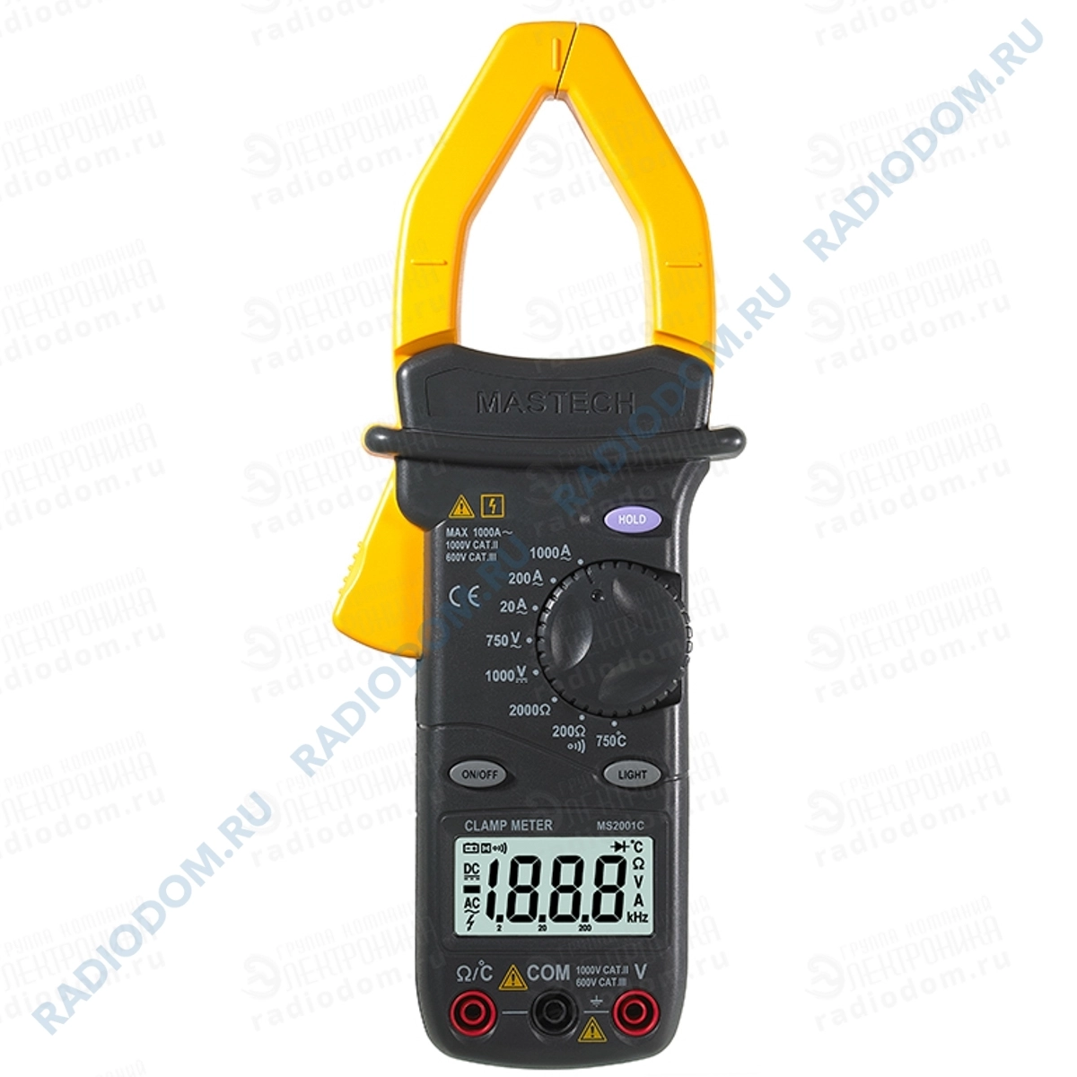 Токоизмерительные клещи Mastech MS2001C предназначены для измерения силы переменного тока, постоянного и переменного напряжения, температуры и сопротивления. С помощью данного прибора можно проверить качество соединений в электрической схеме. Последний полученный результат можно зафиксировать с помощью функции "HOLD". В условиях недостаточной видимости очень поможет подсветка ЖК дисплея. Питание токовых клещей Mastech MS2001C производится от одной батареи 9 Вольт типа "Крона". Токовые клещи Mastech MS2001 имеет сертификат РосТест.