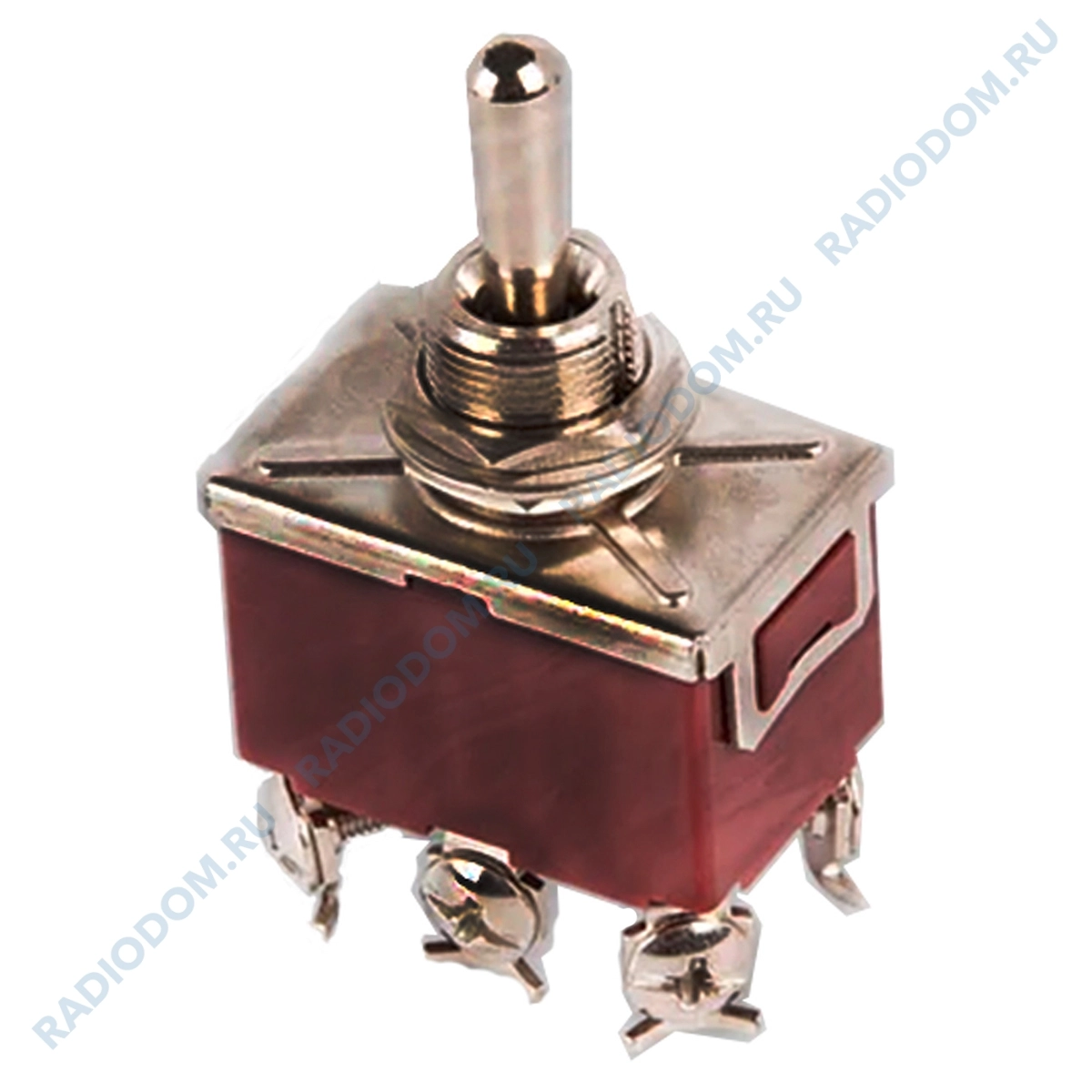 Тумблер 250V 15А (6c) (ON)-OFF-(ON) двухполюсный предназначен для коммутации электрических цепей переменного тока напряжением до 250В. Такая разновидность переключателей применяется на лицевых панелях в качестве комплектующих изделий различного электрооборудования (в измерительных приборах, блоках питания, электроустановках на различных производствах, легковых и грузовых автомобилях, поездах и многих других местах). Отличительной особенностью тумблера является перекидной переключатель, принцип действия которого основан на его перемещении в одну из позиций. Для переключения в нужное положение требуется приложить некоторые усилия. Монтаж осуществляется без применения винтов на плоских панелях толщиной от 0.8мм до 4мм. Подключение контактов осуществляется с помощью винтов.