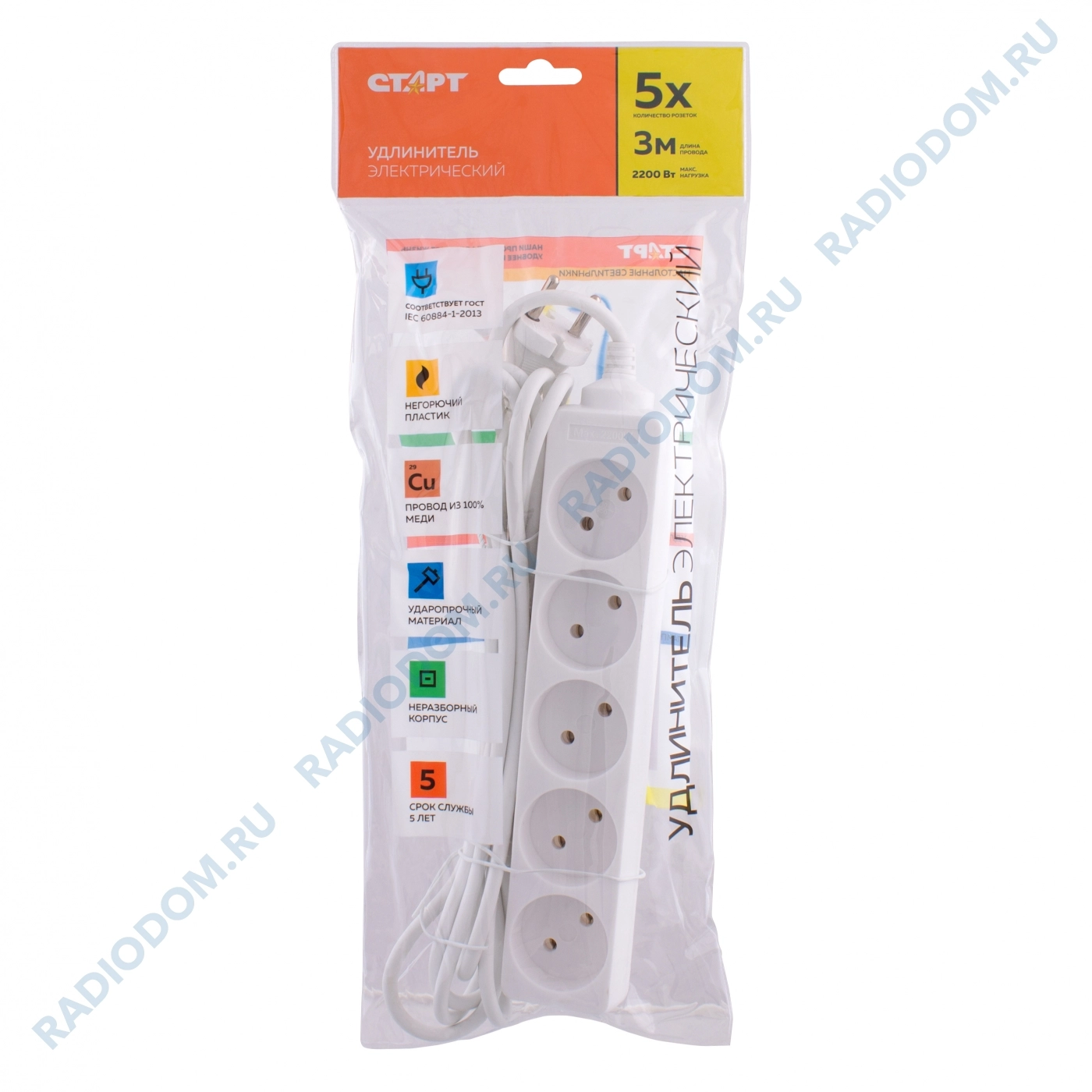 Удлинитель 5-розеток 3м 2x0,75мм 10А СТАРТ