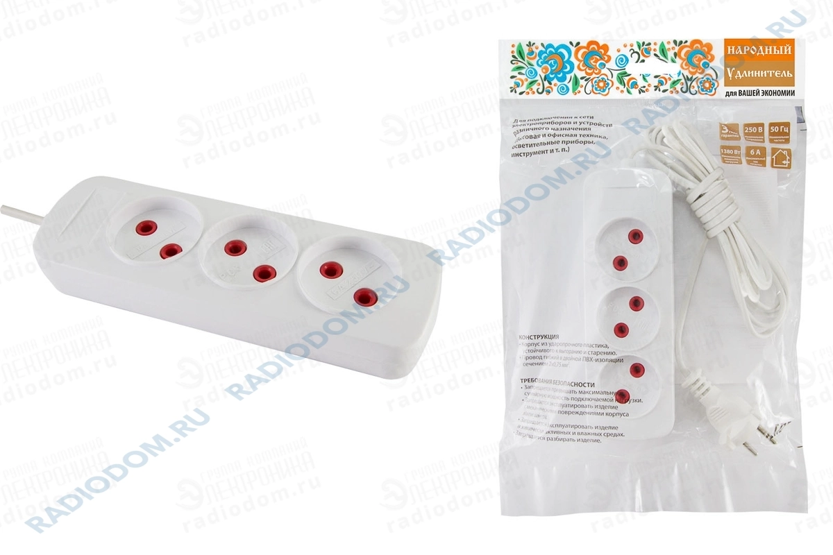 Удлинитель 3 гнезда 10м 6А Народный TDM ELECTRIC