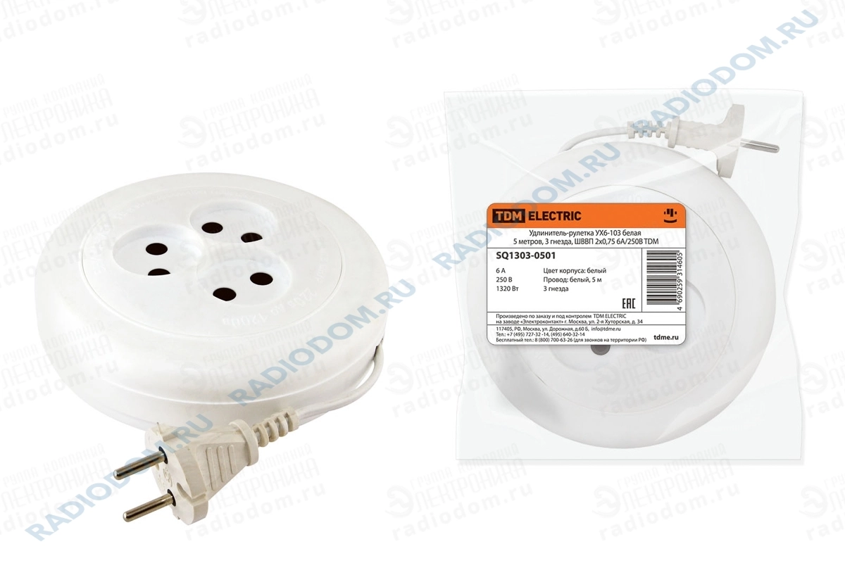 Удлинитель-рулетка УХ6-103 3-розетки 5м ШВВП 2x0,75мм 6А TDM ELECTRIC SQ1303-0501