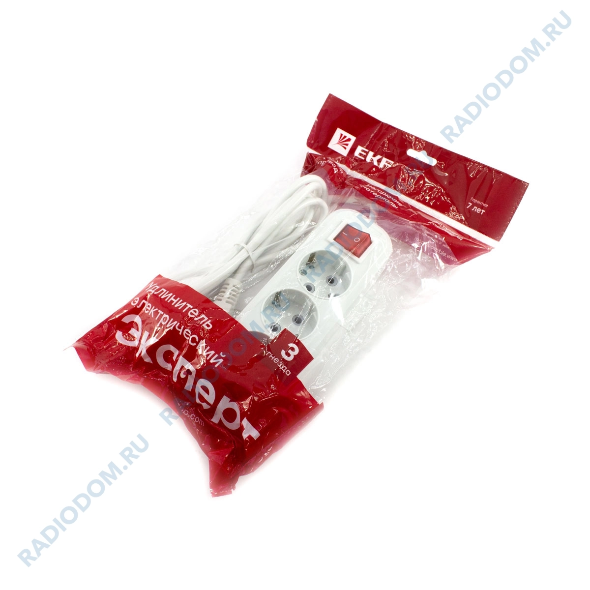 Бытовой удлинитель Эксперт на 3 розетки с заземлением. Используется кабель ПВС длиной 2 метра с сечением 3х1 мм. Удлинитель предназначен для подключения различных бытовых электрических приборов общей мощностью до 3,5 кВт. На корпусе встроена кнопка отключения.
