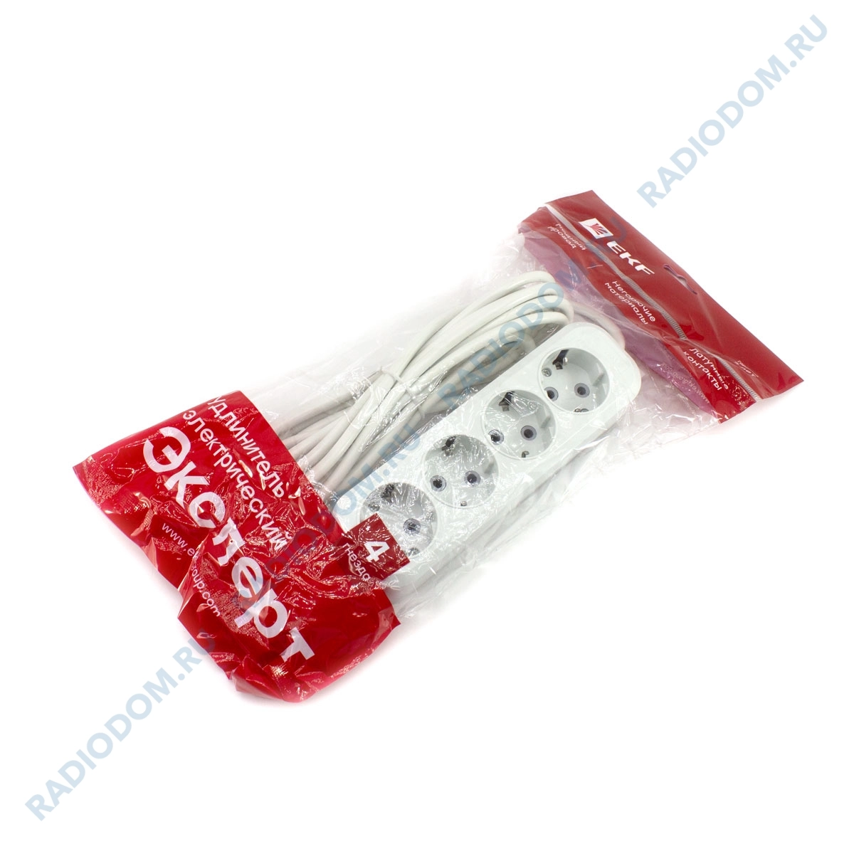 Бытовой удлинитель Эксперт на 4 розетки с заземлением. Длиной 5 метров используется кабель ПВС с сечением 3х1 мм. Удлинитель предназначен для подключения различных бытовых электрических приборов общей мощностью до 3,5 кВт.