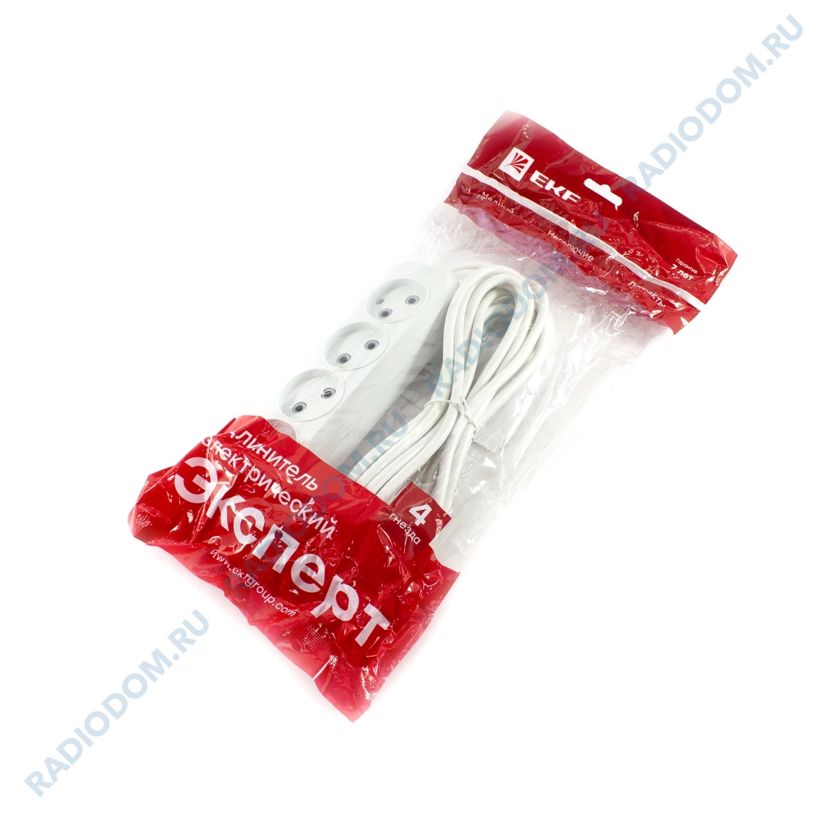 Бытовой удлинитель Эксперт на 4 розетки без заземления. Длиной 5 метров используется кабель ПВС с сечением 2х0,75 мм. Удлинитель предназначен для подключения различных бытовых электрических приборов общей мощностью до 2,2 кВт.
