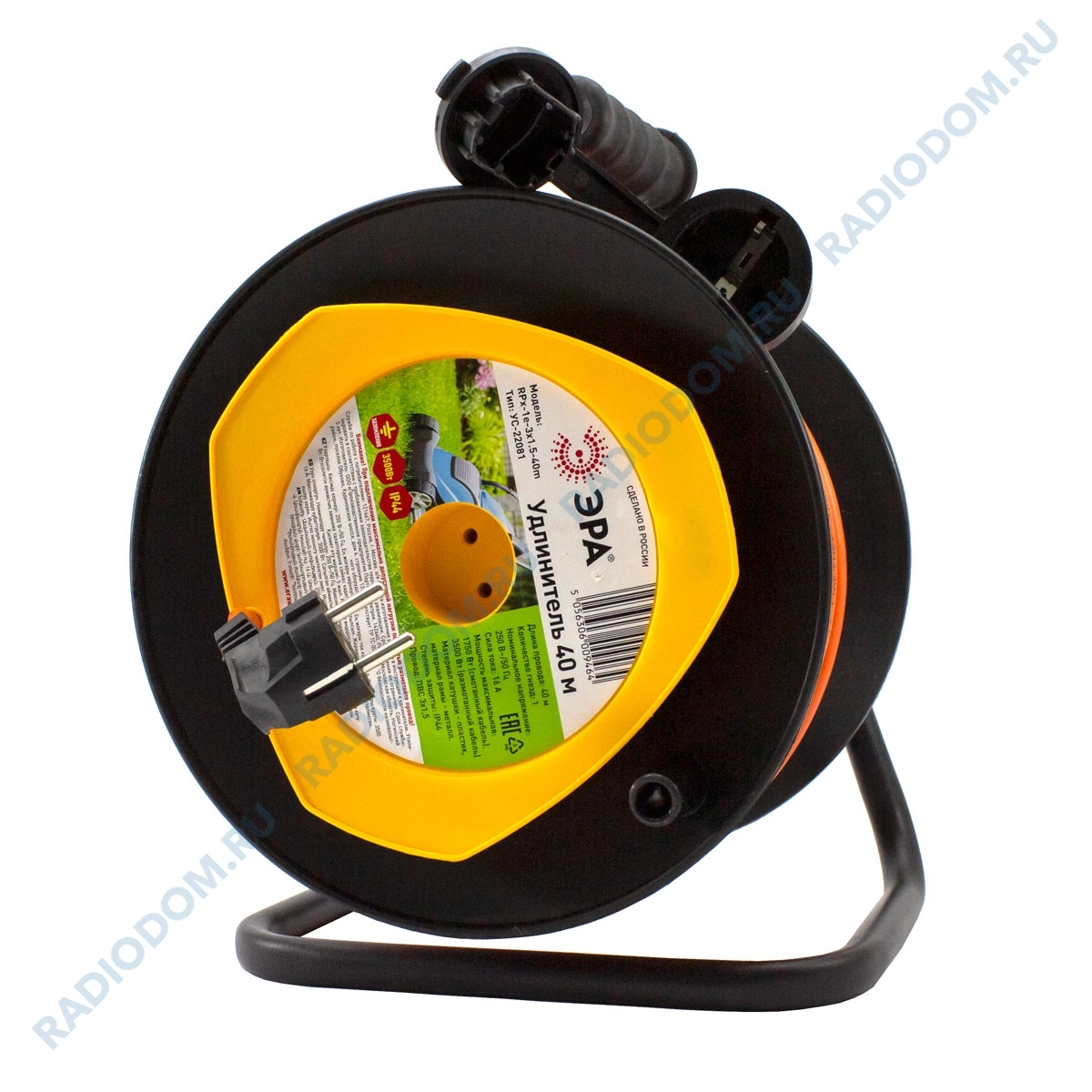 Удлинитель силовой на пластиковой катушке ЭРА RPx-1е-3x1.5-40m с заземлением, ПВС 3х1,5м2, 1 розетка, 40 м. Мощность 16А/3500Вт. Используется для работы на строительных площадках или дачных участках. Удобен при работе с приборами находящимися удаленно от стационарной розетки. Например, газонокосилки, электрические, пилы, триммеры или электродрели. Провод в удлинителях Эра сделан из 100% меди, что делает его абсолютно пожаробезопасным. Рама удлинителя сделана из высокопрочной стали а пластиковый корпус выполнен с применением негорючих добавок.