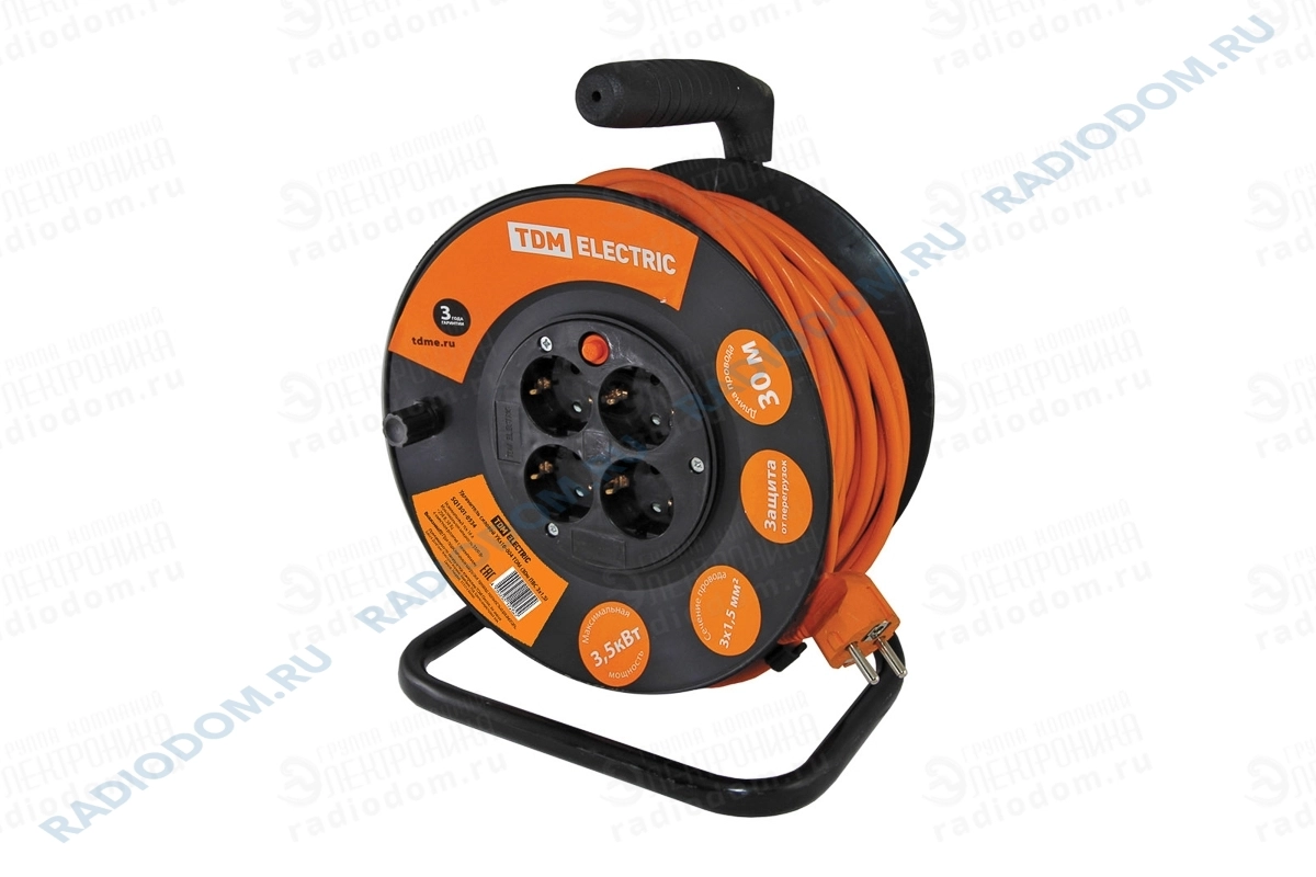 Удлинитель 4-розетки 30м на катушке с заземлением 16А УКз16-004 ПВС 3*1,5 TDM ELECTRIC SQ1301-0534