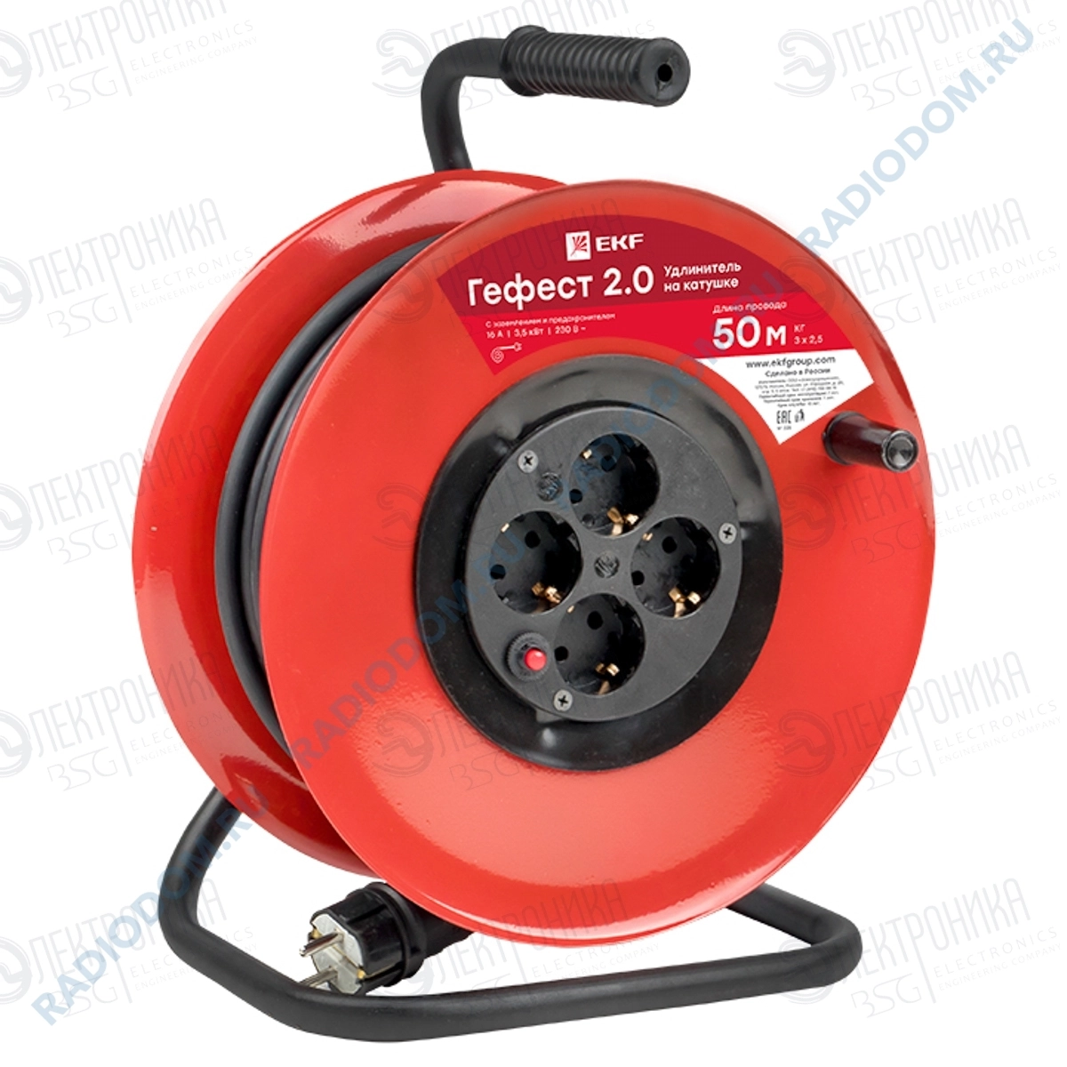 Надежный удлинитель Гефест выполнен на металлической катушке и имеет 4 гнезда розетки с заземлением на корпусе. Кабель КГ длиной 50 метров выполнен в резиновой изоляции и выдерживает суммарную нагрузку до 3,5 кВт.