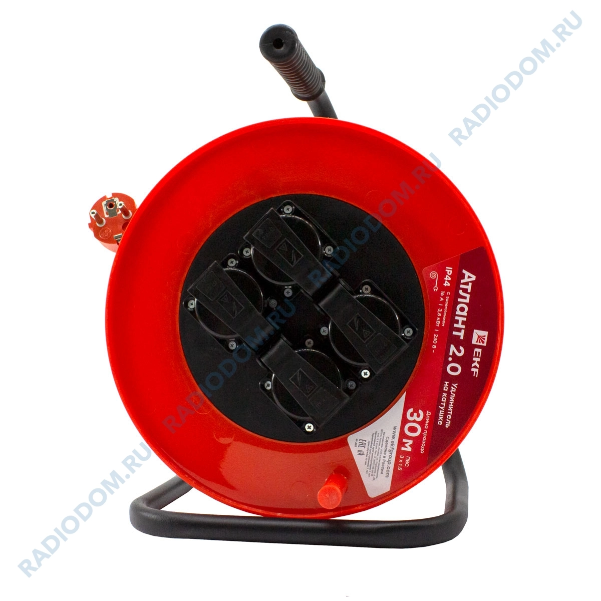 Удлинитель на катушке ~AC 4-розетки 30м с заземлением 16A 3x1,5 Атлант 2.0 PROxima EKF