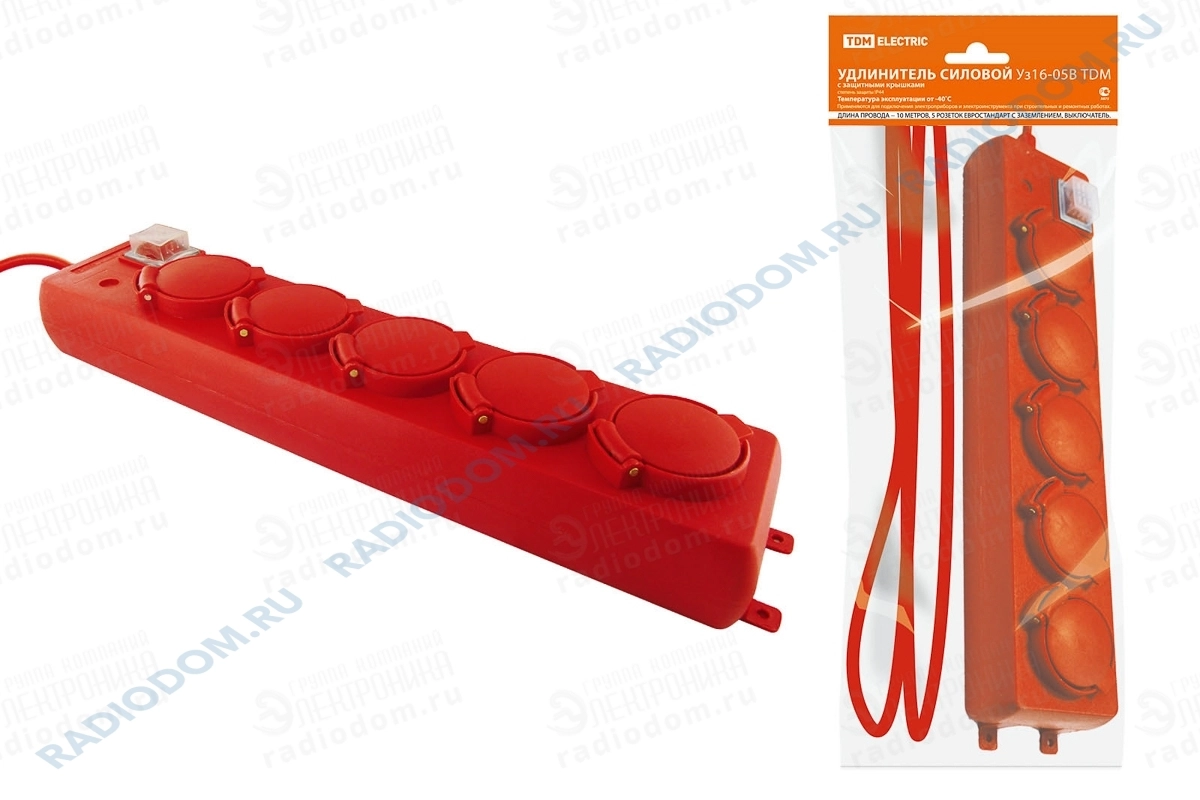 Удлинитель 5-розетки 10м с заземлением, с крышкой красный Уз16-05В TDM ELECTRIC SQ1303-0023