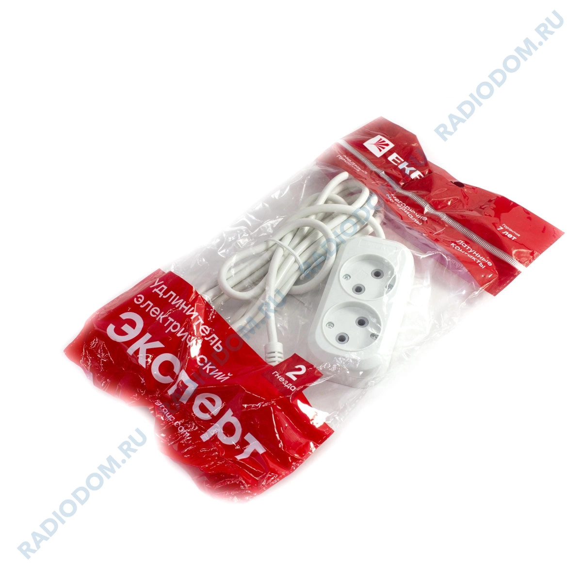 Бытовой удлинитель Эксперт на 2 розетки без заземления. Длиной 3 метра используется кабель ПВС с сечением 2х0,75 мм. Удлинитель предназначен для подключения различных бытовых электрических приборов общей мощностью до 2,2 кВт.