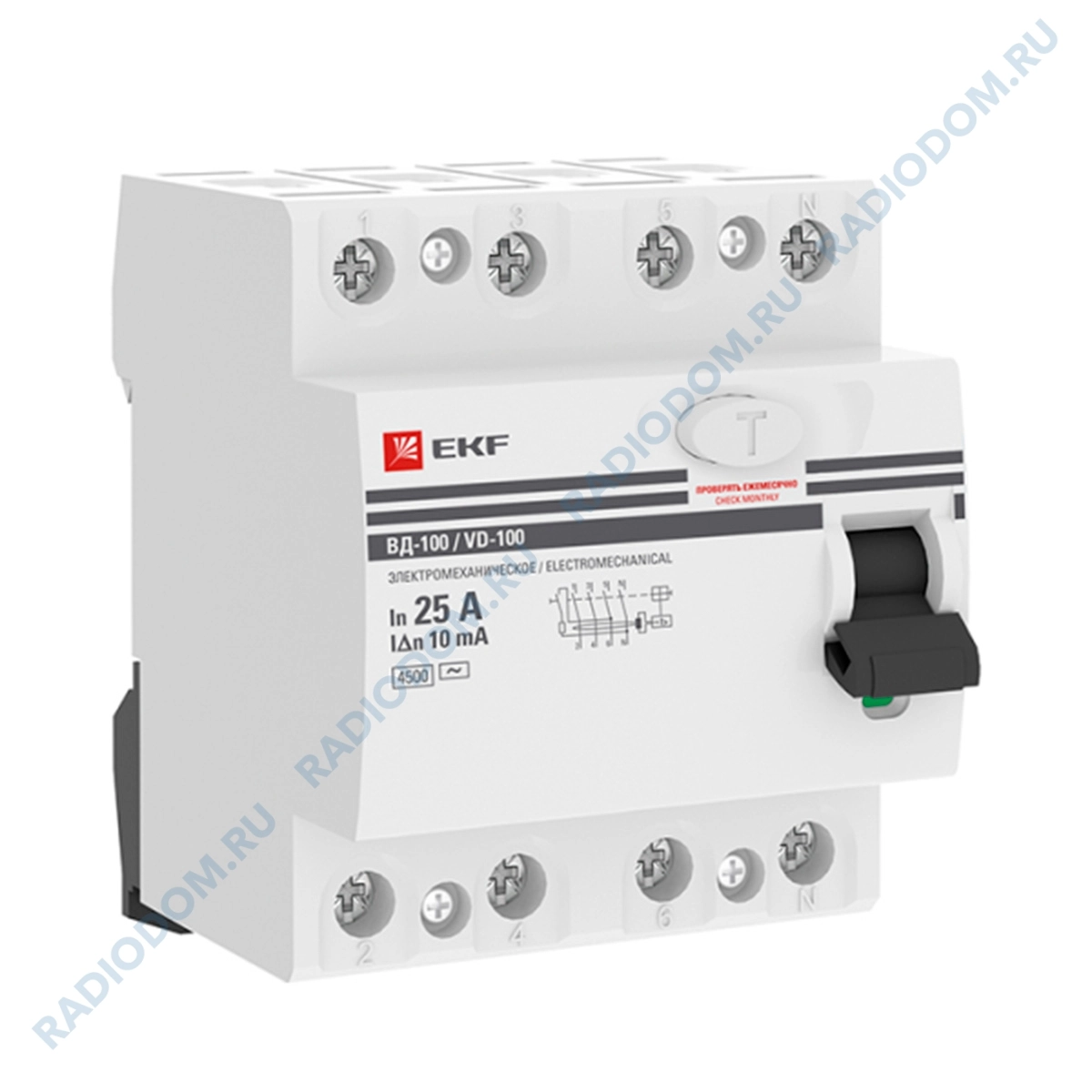 Электромеханическое устройство защитного отключения ВД-100 используются для защиты от поражения электричеством при взаимодействии с неисправным электрооборудованием и предотвращении возгорания при длительном прохождении токов утечки. Устанавливается совместно с автоматическими выключателями. При обнаружении неисправности УЗО отключит автомат для прекращения подачи электричества на защищаемый участок цепи. Номинальный ток 25 А. Срабатывание при дифференциальном значении 10 мА.. Ширина равна 4 модулям. Глубина установки 66 мм. Общее количество полюсов – 4. Номинальная отключающая способность 4,5 кА.. Возможна коммутация медным и алюминиевым проводником. Максимальное сечение подключаемого кабеля 25 мм2.Гарантия от производителя 7 лет.