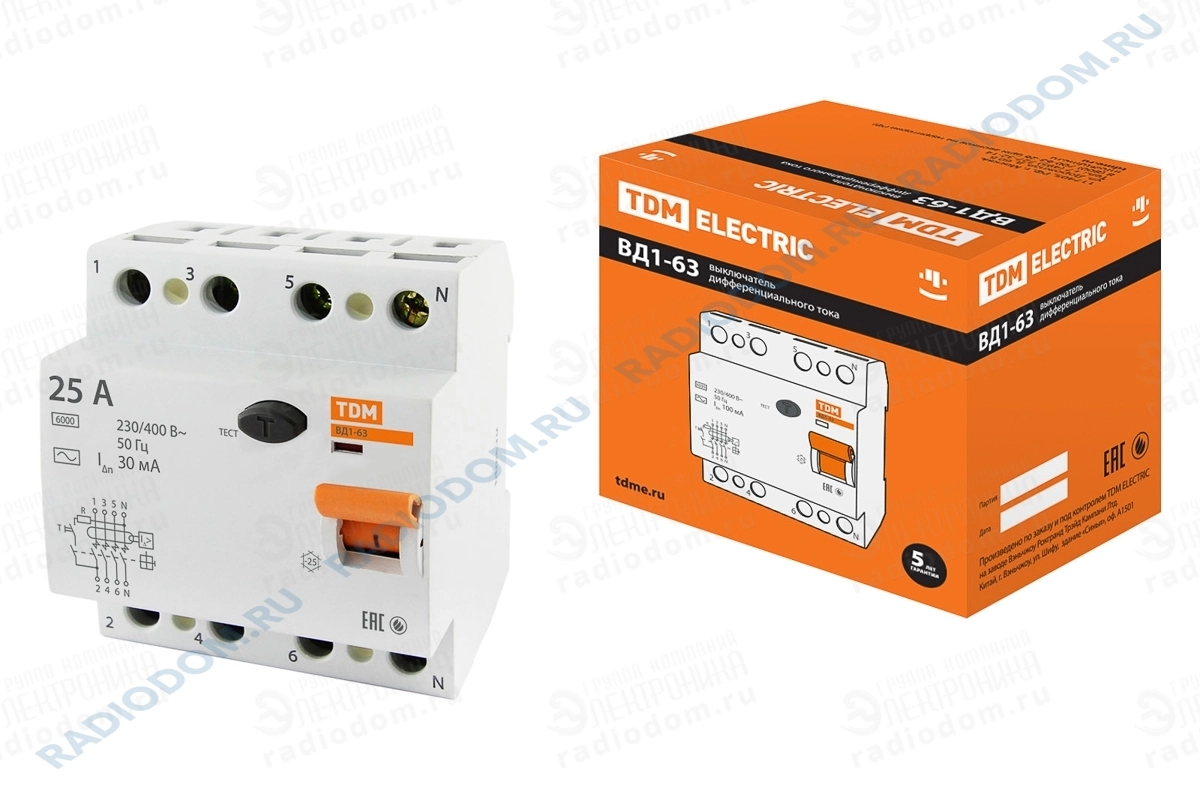Устройство защитного отключения 4Р 25А 30мА ВД1-63 TDM ELECTRIC