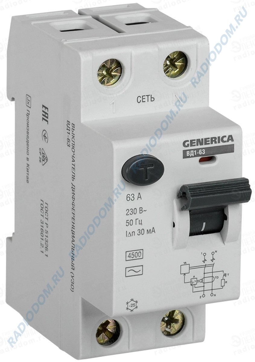 Устройство защитного отключения 2Р 63А 30мА ВД1-63 Generica iEK