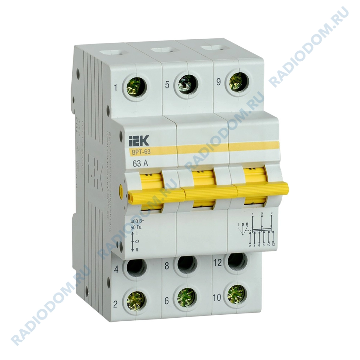 Выключатель-разъединитель трехпозиционный ВРТ-63 предназначен для коммутации смешанных активных и индуктивных нагрузок в цепях переменного тока напряжением до 400 В частотой 50 Гц. Применяется в качестве учетно-распределительного оборудования жилых и общественных зданий и сооружений, где предусматривается необходимость в оперативном отключении от сети отдельных групп электропотребителей или участков электрокоммуникации.