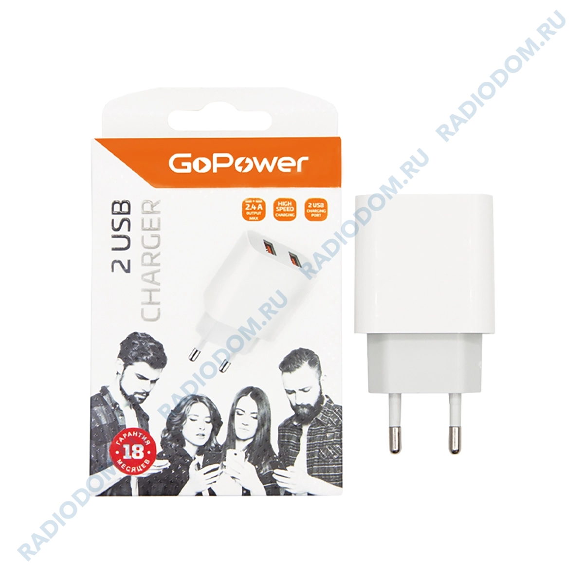 Сетевое зарядное устройство 5,0В 2,4А гнездо USBx2шт белый GoPower