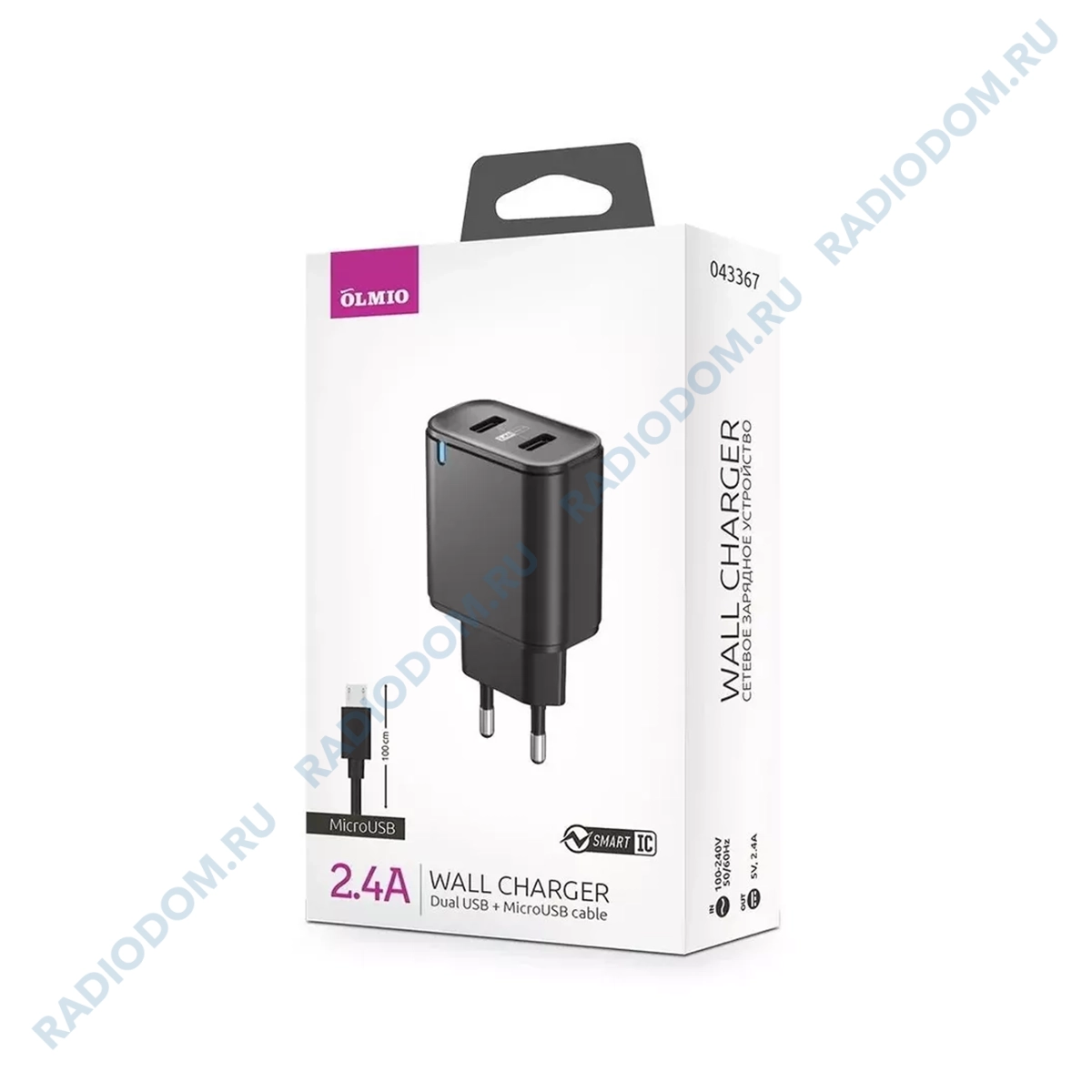 Сетевое зарядное устройство 2,4А 2хUSB + кабель microUSB SmartIC OLMIO