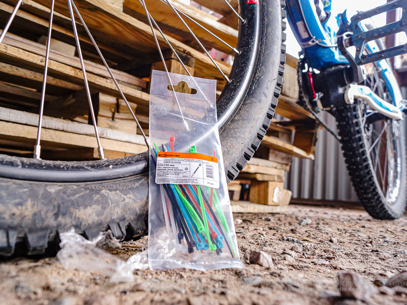 Стяжка кабеляНейлоновая стяжка прекрасно подойдет для временного, но надежного крепления. Также стяжки будут полезны в поездках на велосипеде в холодное время года (можно закрепить стяжку на колесах, замочком вниз, чтобы не скользить по гололеду).